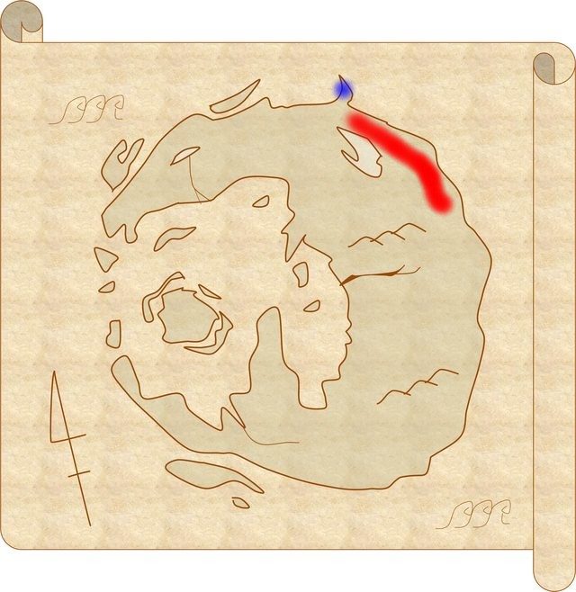 赤線あたりにも山脈はありそう。で、この辺はドワーフが住んでそうだね。ちょうどエルフたちと相対する形にもなるし。湖に流れる水の源泉にもなりそう。